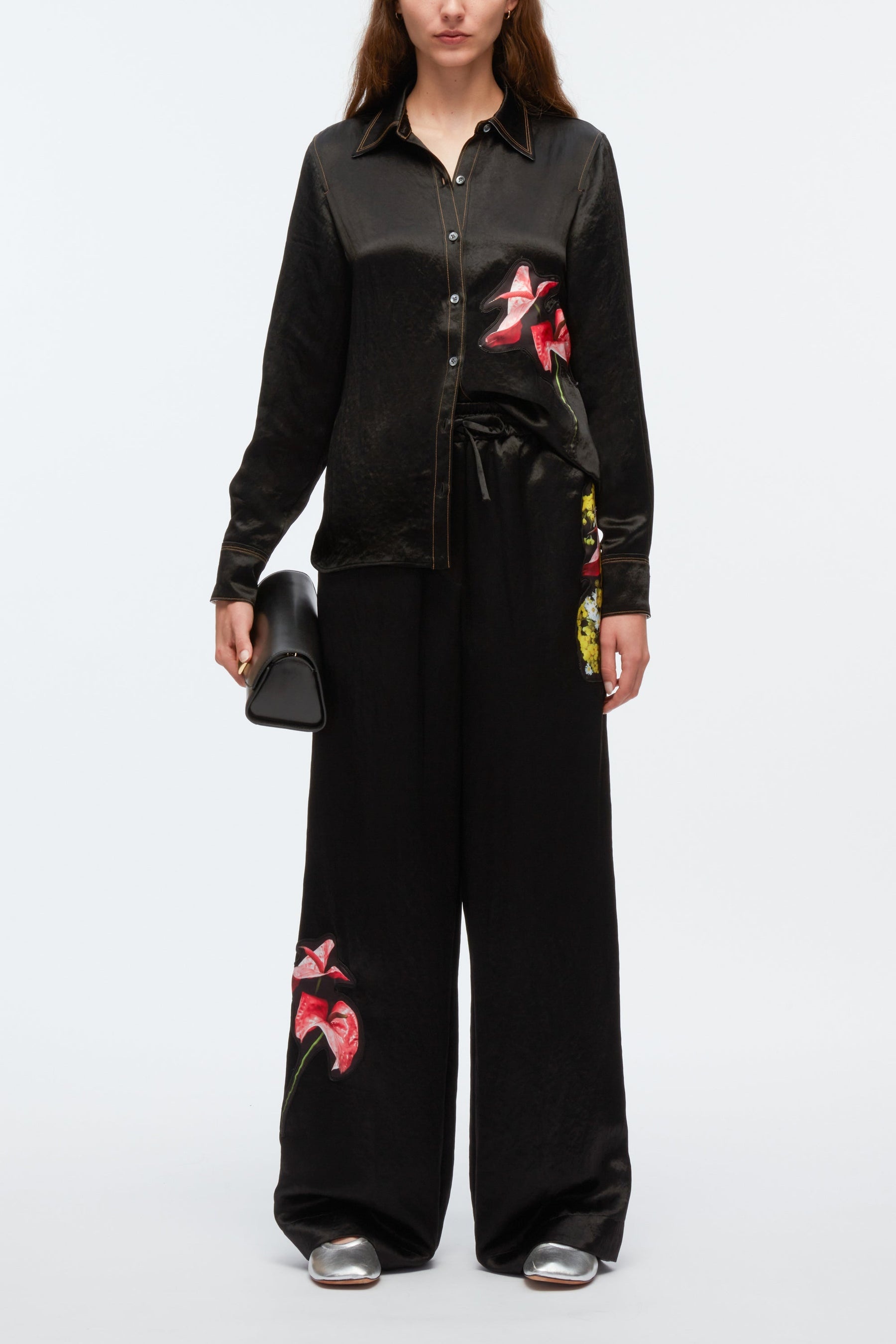 PS24 | A subtle sheen elevates the classic silhouette of this shirt while a blooming floral applique adds an unexpected statement. It’s framed with a point collar and detailed with contrast stitching. - Satin finish - Point collar - Long sleeves with button cuffs - Floral applique - Button front fastening - Curved hem - 100% acetate - Slim fit - Professional dry clean only - Model Height: 5'10', Bust: 30', Waist: 23', Hips: 34' and wearing a size 4