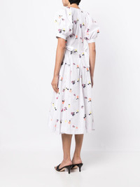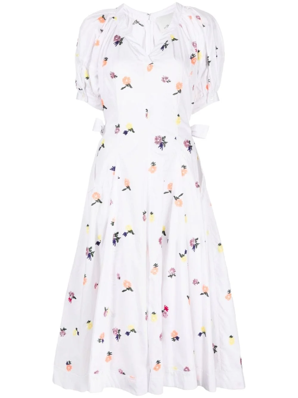 floral-embroidered puff-sleeved dress Highlights - White/multicolour - Cotton - All-over floral embroidery - V-neck - Side tie fastening - Short puff sleeves - Box-pleat detail - Flared - Mid-length Imported Composition Cotton 100% SIZE & FIT Model measurements Height 5 ft 10 in(1.77 m) Bust/Chest 31.49 in(80 cm) Hips 35.43 in(90 cm) Waist 25.19 in(64 cm) FittingInformation Designed for a close fit at the chest and waist with a loose fit at the hip The adjustable tie waist gives a more adaptable and personalised fit Made from a midweight non-stretch fabric This piece fits large – take one size down Washing instructions Dry Clean Only