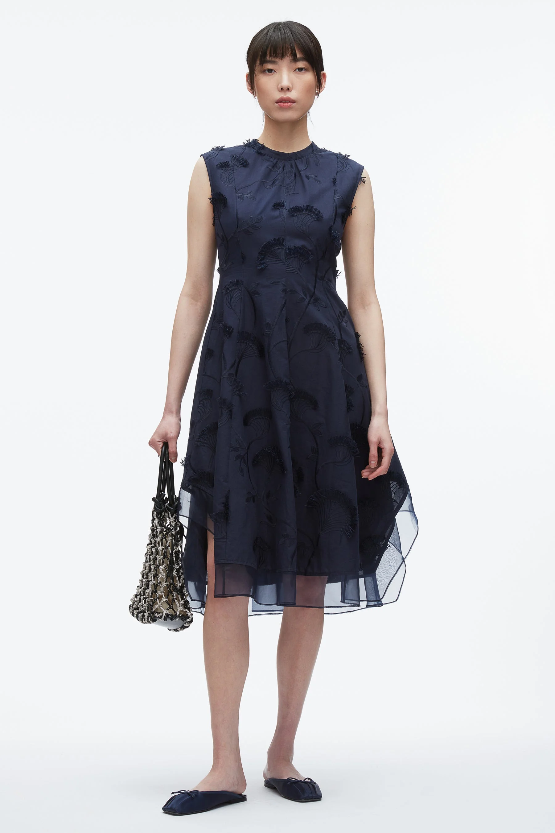 A quiet statement in texture and movement, this sleeveless dress is cut from airy cotton voile with embroidered fil coupe inspired by growing wheat stalks. The sculptural silhouette is softened by a sheer organza hem, while subtle pleating at the neckline adds dimension. Light yet polished—perfect for warm-weather moments that call for a touch of elegance. - 100% Cotton - Model is 5'10', Bust: 30', Waist: 23', Hips: 34' and wearing a size 4 - Professional dry clean only