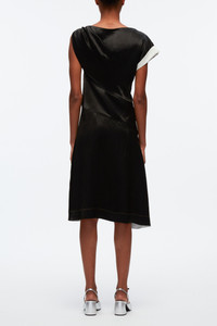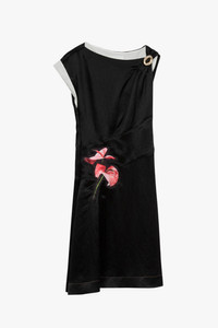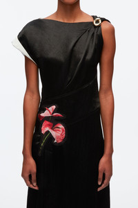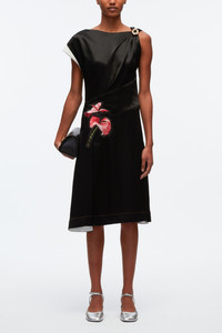 PS24 | This midi dress is cut from fluid satin with a sculptural twist at one shoulder. It's enlivened with exotic floral motifs that pop against the lustrous black background. - Satin - Boat neck - Gathered shoulder - Short sleeve with fold-over cuff - Asymmetric waist - Floral appliques - Pleated skirt with front split - Draped mid-length hem - Concealed zip side fastening - Slim fit - 100% acetate - Professional dry clean only - Model Height: 5'10', Bust: 30', Waist: 23', Hips: 34' and wearing a size 4