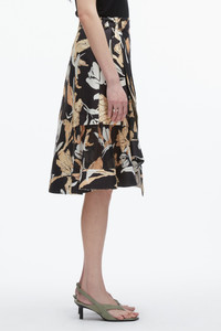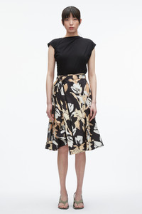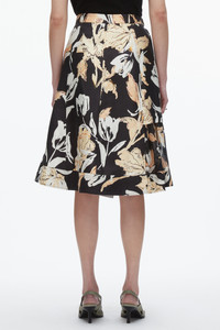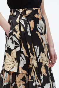 Romance with graphic impact. This A-line midi skirt is cut from crisp cotton-silk oxford, printed with our custom falling tulip and lily motif—striking the balance between softness and strength. A wrap-style front and D-ring belt nod to utility, while soft pleats and a sheer crinkle chiffon side panel add unexpected texture and movement. Style it with a draped tee or tailored shirt for a modern, everyday statement. - 48% Cotton, 52% Silk - Model is 5'10', Bust: 30', Waist: 23', Hips: 34' and wearing a size 4 - Professional dry clean only