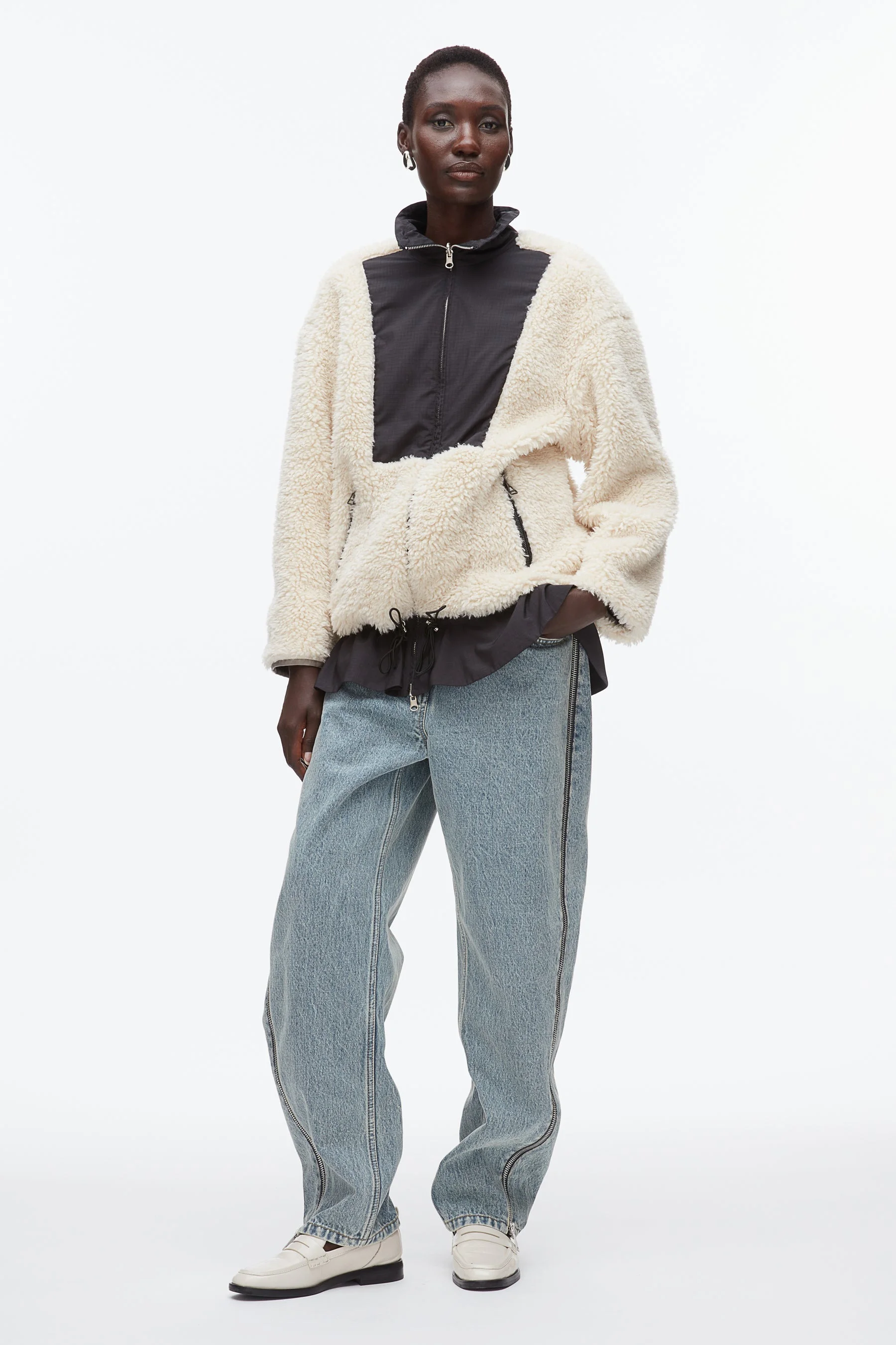 Crafted from plush recycled sherpa and lightweight recycled ripstop, this fleece jacket blends softness with sport for a fresh take on transitional layering. The voluminous silhouette is cinched at the hem with a ruffled drawstring, adding a hint of whimsy while sealing in warmth. A contrast nylon panel zips to the collar for utilitarian edge and wind-blocking function. Equal parts cozy and directional—it’s your new go-to for modern ease. - 100% Polyester - Model is 5'10', Bust: 30', Waist: 23', Hips: 34' and wearing a size 4 - Professional dry clean only