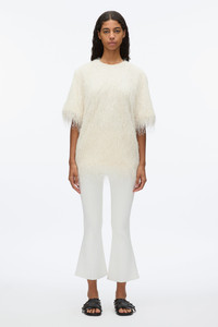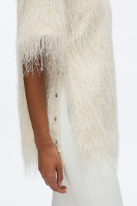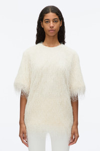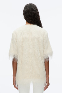 Effortless shape contrasted with unexpected texture, this boxy fit Tee embodies casual glamour. Rendered in stunning micro fringe that is flirty in movement, it features a center back zip. Dressed down with our Utility Trouser with pair back to slip skirt for new take on evening. - 100% Polyester - Model is 5'10', Bust: 30', Waist: 23', Hips: 34' and wearing a size Small - Professional dry clean only