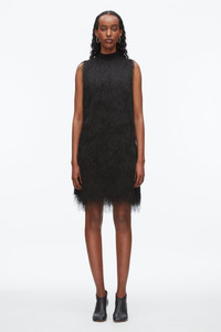 Effortlessly blending texture with casual glamour, this dress features a sleeveless silhouette adorned with fine, dynamic detailing that moves gracefully with you. The contrasting mockneck trim adds a refined touch, balancing the tactile surface with clean, modern lines. Subtly striking, it’s designed to transition seamlessly from day to night. Pair it with minimalist accessories for a polished look that embodies understated elegance. - 100% Polyester - Model is 5'10', Bust: 30', Waist: 23', Hips: 34' and wearing a size 4 - Professional dry clean only