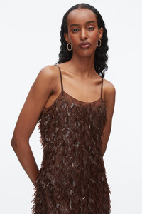 A showstopper in motion. This midi slip dress shimmers with tonal chocolate-brown fringe sequins, offering rich texture and dynamic movement. Framed by a sheer chiffon base and finished with delicate satin binding, it’s designed to catch the light—and attention—with every step. A refined yet playful statement for any occasion. - 100% Polyester - Model is 5'10', Bust: 30', Waist: 23', Hips: 34' and wearing a size 4 - Professional dry clean only