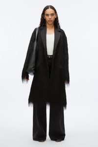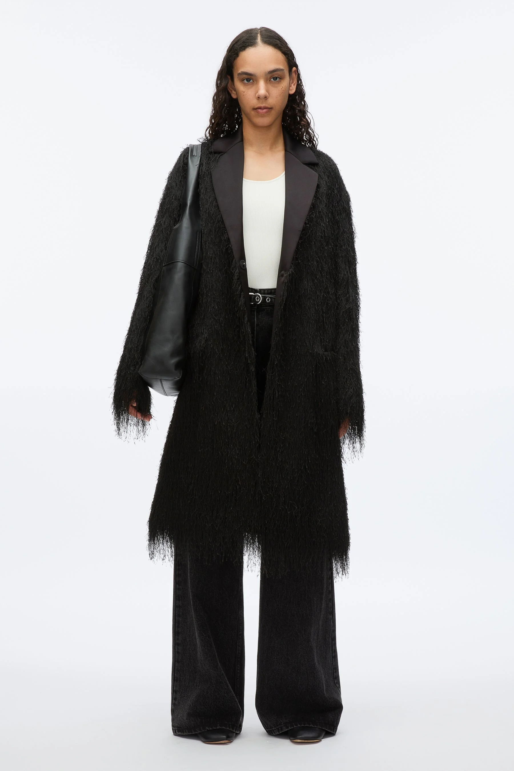 Modern glamour redefined in this striking tuxedo coat, crafted in fluid micro fringe. The relaxed silhouette makes it the perfect topper to elevate any look with ease. Finished with a contrast satin lapel for a sharp, refined touch. - 100% Polyester - Model is 5'10', Bust: 30', Waist: 23', Hips: 34' and wearing a size Small - Professional dry clean only