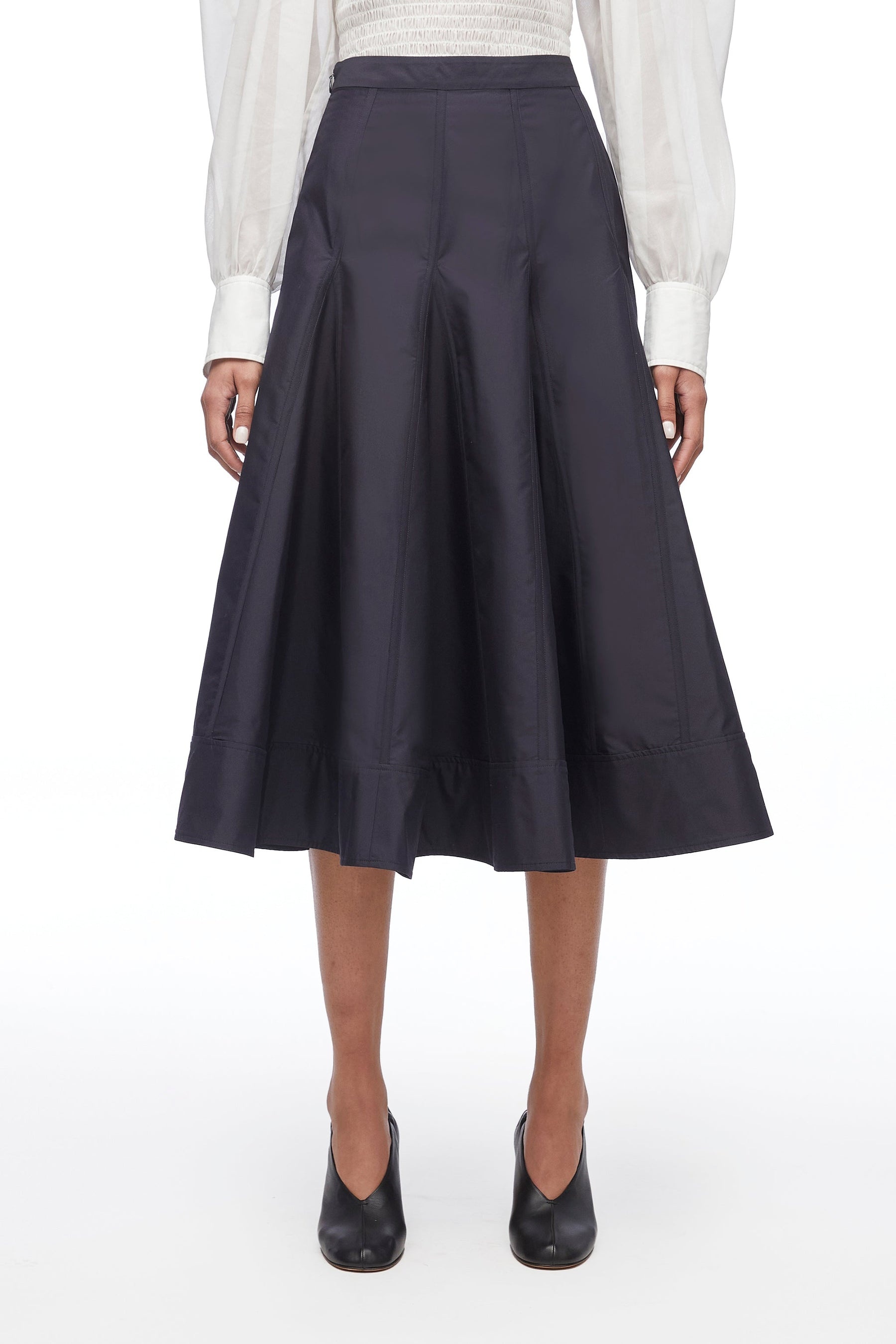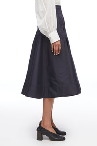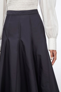 3.1 Sustainable Balance This skirt is produced with 3.1 sustainable materials. This can be recycled, 100% natural or archive fabric. Read more about our steps towards sustainability here. A-line skirt in cotton poplin blend with a paneled construction. Features a fitted high waist and a flared mid length hemline. Concealed zip back closure. - High waist - Flared mid length hemline - Concealed zip back closure - Model Height: 5'10', Bust: 31', Waist: 23', Hips: 34' and wearing a size 2