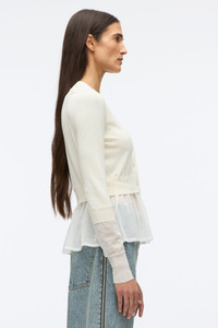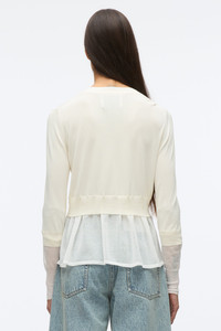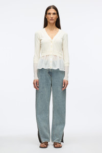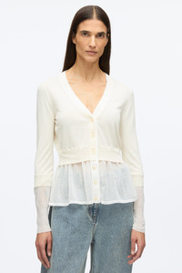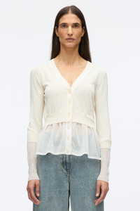 A delicate reinvention of the classic cardigan. Crafted from a fine knit, this piece is designed with a deep V-neckline and a sheer, gauzy peplum that adds an air of lightness and movement. Soft and fluid, it drapes effortlessly for a look that is both relaxed and refined. Pair it with denim for a touch of everyday romance or layer over a slip dress for an ethereal finish. - 75% Viscose 20% Polyamide 5% Elastane - Model is 5'10', Bust: 30', Waist: 23', Hips: 34' and wearing a size 4 - Professional dry clean only