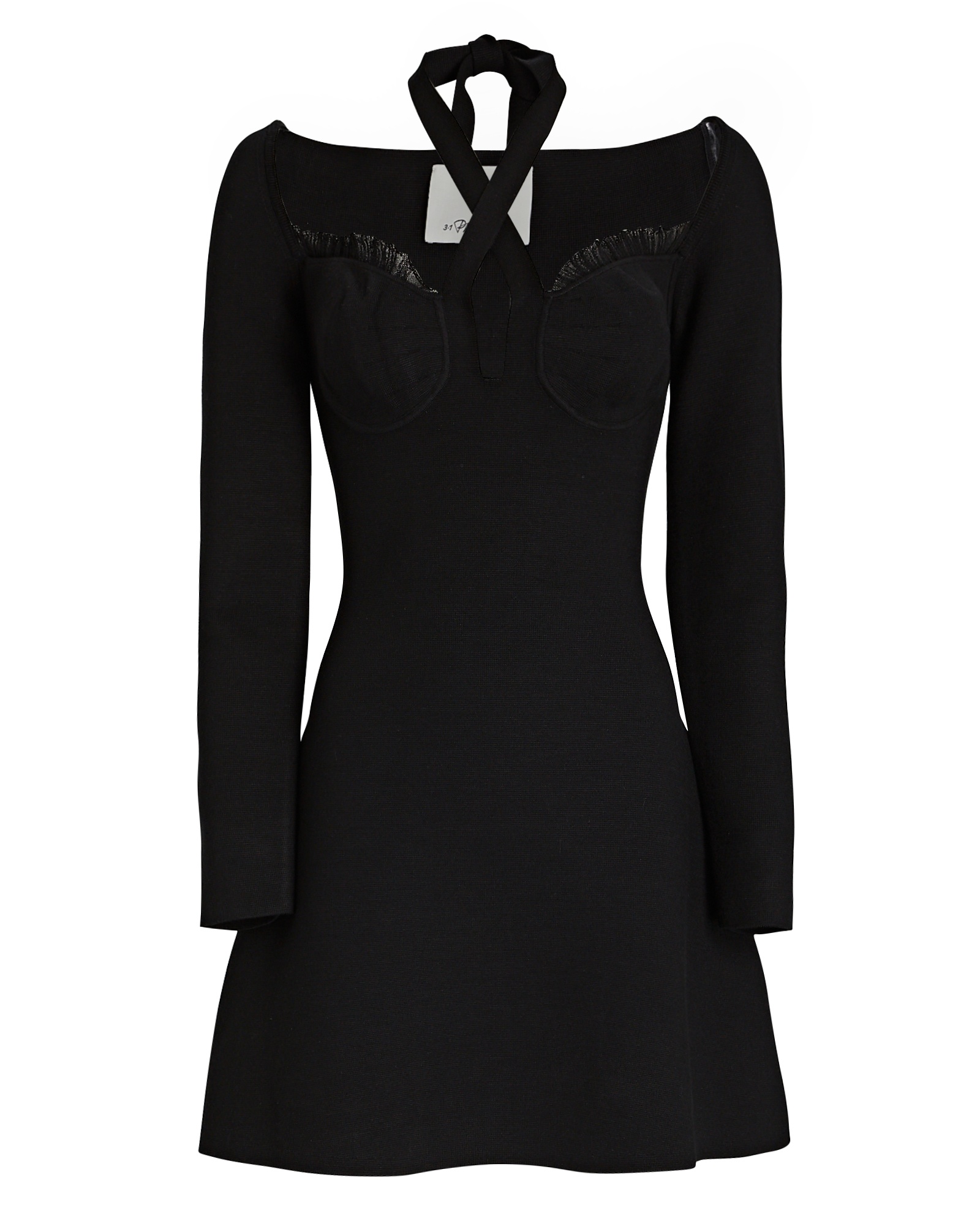 Product Details An edgy update to the classic 'LBD', the label's dress is cut from a compact Milano stitch with pointelle details and dramatic halterneck. Wear yours with drop earrings and a mini clutch. - Fabric: 72% viscose, 28% nylon - Halter neck tie - Dry clean - Imported - Length from shoulder to hem: 34" - Model is wearing size S - Model height 5'10", bust 32", waist 24", hips 36"