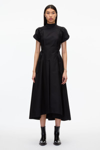A-line dress in cotton poplin with a mock neck and short puff sleeves. Features extended ties and silver toned metal D-ring buckles at the waist. Asymmetric mid length hemline. Concealed zip back closure. - Slim fit. - Mock neck - Short puff sleeves - Extended side ties with D-ring buckles at the waist - Asymmetric mid length hemline - Concealed zip back closure - Model Height: 5"10', Bust: 31', Waist: 23', Hips: 34' and wearing a size 2