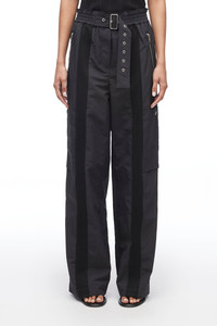 Effortless 3.1 cargo pant in recycled tech poly is off-duty cool the 3.1 way. This cinched-waist pant with utility belt has a wide leg for a relaxed fit and side pockets. Made from second generation materials, this pant is cool, easy, chic and sustainable. Wear it with the matching tech poly jacket for the full set, or on its own with the Pashli Moto bag and a kitten heel to dress it up for a night out. - High waist - Adjustable buckled belt - Side zip and patch pockets - Concealed front closure - Relaxed fit - Model Height: 5"10', Bust: 31', Waist: 23', Hips: 34' and wearing a size XS