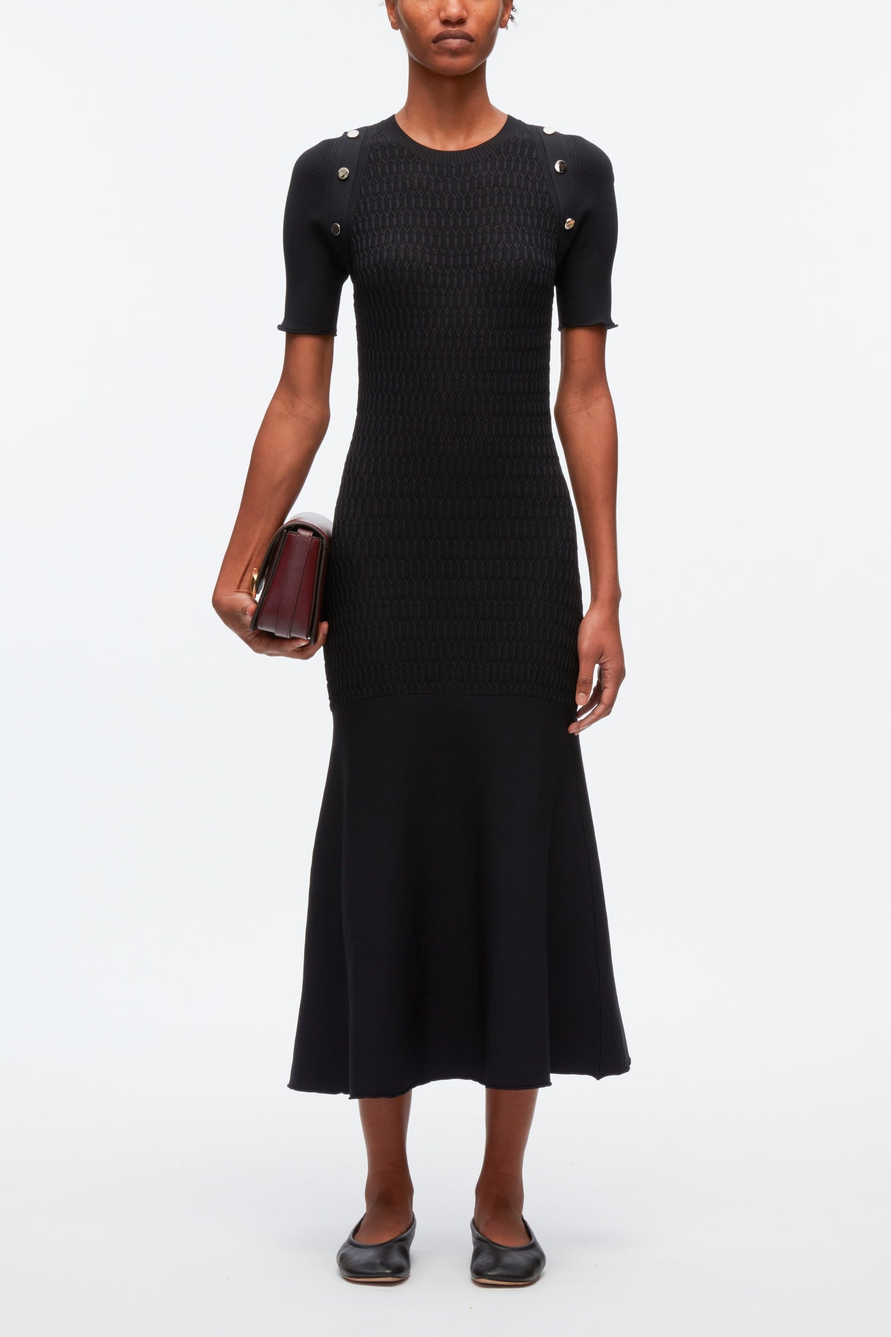 PS24 | This dress is woven from lightweight yarns and detailed with honeycomb stitching, creating texture and depth. A row of polished buttons at the shoulder adds an unexpected note, while a softly flared hem brings volume to the sculpted silhouette. - Honeycomb knit - Crew neck - Buttons at shoulders - Short sleeves - Pleated skirt - Straight hem - Slim fit - 71% viscose, 29% nylon - Professional dry clean only - Model Height: 5'10', Bust: 30', Waist: 23', Hips: 34' and wearing a size Small