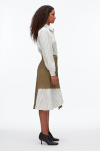 A modern twist on the classic shirtdress. This all-in-one design merges utility and tailoring with playful deconstruction. Cut from crisp cotton poplin and sturdy utility twill, it splices a striped button-down shirt with a structured khaki wrap skirt, complete with a cargo pocket and D-ring belt. An asymmetric hem reveals hidden layers, adding movement and intrigue. Polished enough for the office yet effortless enough for dinner after, it’s a versatile piece that carries you seamlessly through the day. - 65% Cotton, 35% Polyester - Model is 5'10', Bust: 30', Waist: 23', Hips: 34' and wearing a size 4 - Professional dry clean only