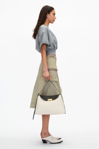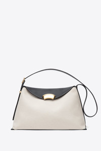 The soft, slouchy design of this ID Soft Shoulder Bag is rendered in a cotton canvas with contrast leather trims. Trapezoidal silhouette suspends from an adjustable shoulder strap and has a front flap closure punctuated with an ID bracelet-inspired plaque. - 100% Cow Leather - Lining: 100% Cotton - Height: 10" - Width: 16" - Depth: 8" - Handle Drop: 16''