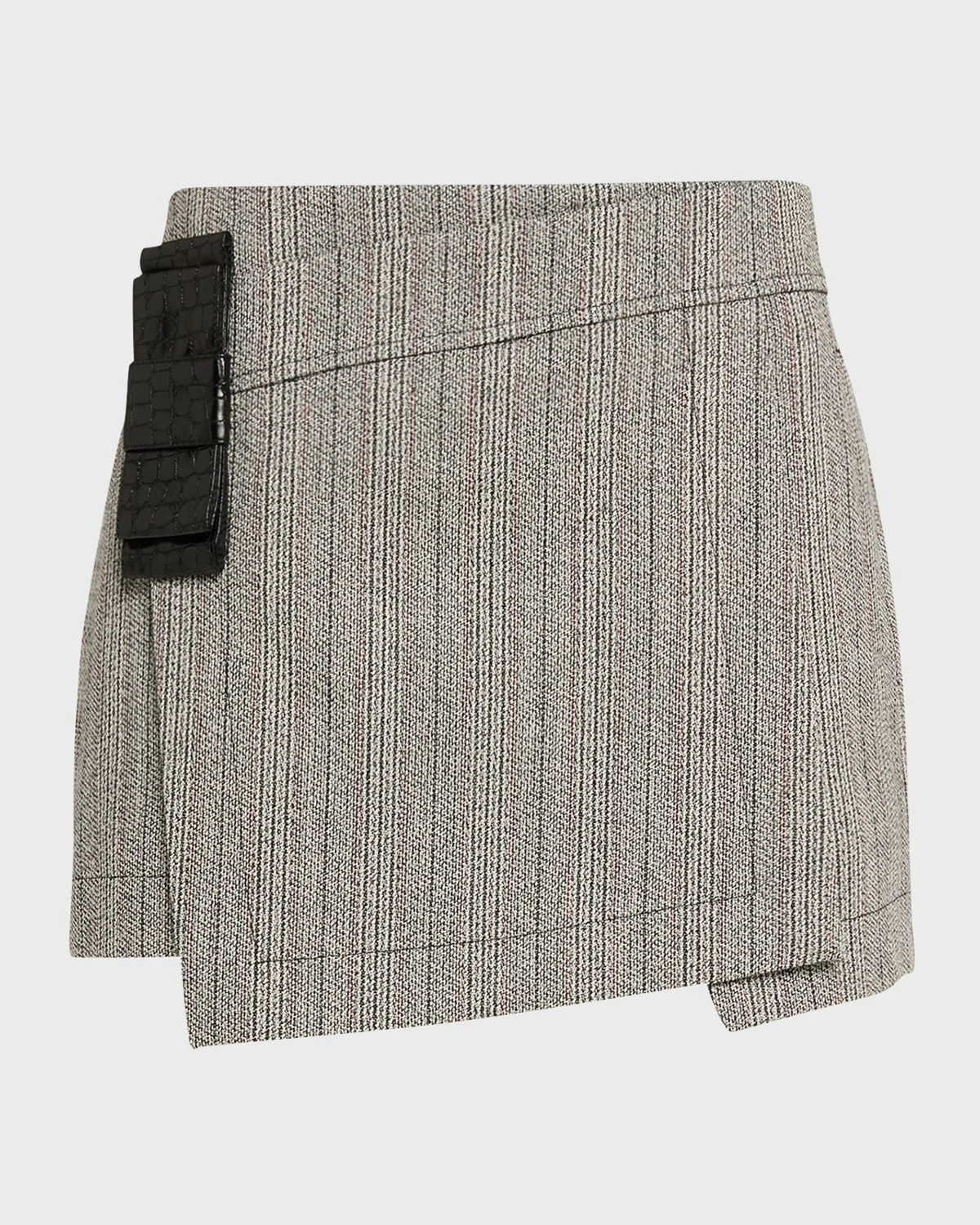 Tailored in Italian jaspe wool, this 3.1 Phillip Lim overlay mini skirt boasts a crocebossed vegan leather bow for an edgy finish with versatile styling. High rise Wrap silhouette Hem falls above the knee Center back zip Wool/cotton/polyester Lining: Cupro Dry clean Imported
