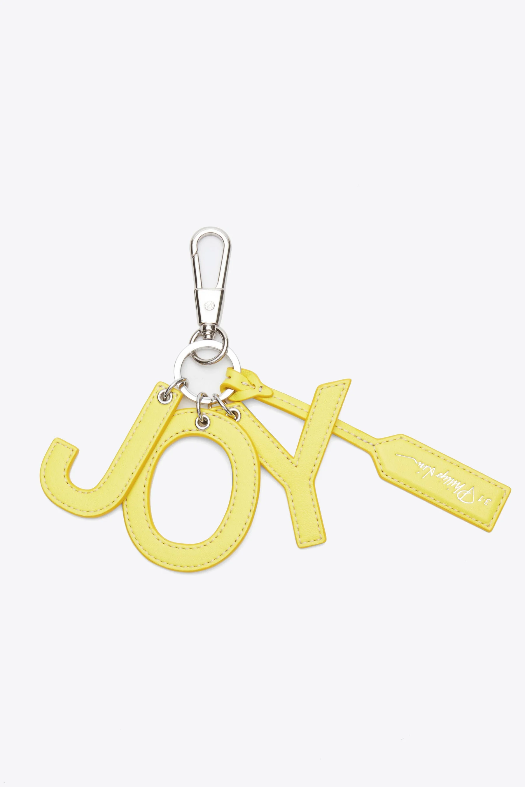 Sample sale style from the 3.1 Phillip Lim archives. Offered for final sale for a limited time. Limited quantity available. A little dose of happiness to carry with you everywhere. This playful keychain spells out “JOY” in bold, bright leather, complete with contrast stitching and a polished metal clasp for easy attachment. Clip it onto your bag, keys, or belt loop for a touch of optimism wherever you go. - 50% Cow Leather, 25% Glass Stones, 25% Microfiber - Height: 7.1" - Width: 6" - Depth: 0.2"