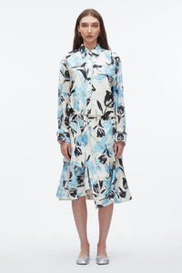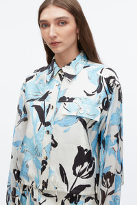 Rooted in New York, with a view on wanderlust. This cropped button-down features our custom falling tulip and lily print on silk-cotton oxford, contrasted with sheer crinkle silk sleeves for soft dimension and movement. Polished rosegold buttons and an adjustable drawcord hem add a touch of modern utility to this painterly piece. Wear it with the matching skirt for a bold floral moment, or pair it with tailored trousers for a grounded take on femininity in motion. - 48% Cotton, 52% Silk - Model is 5'10', Bust: 30', Waist: 23', Hips: 34' and wearing a size 4 - Professional dry clean only