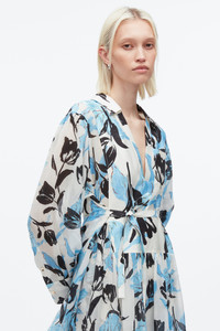 Cut in our custom Joyful Tulip print, this day dress pairs crisp cotton-silk oxford with airy crinkle chiffon for a play on texture and lightness. A sharp collar and V-neckline lend polish, while a floaty skirt and sheer sleeves move with ease. Cinch the waist with the self-belt or wear loose for an effortless silhouette. - 48% Cotton, 52% Silk - Model is 5'10', Bust: 30', Waist: 23', Hips: 34' and wearing a size 4 - Professional dry clean only
