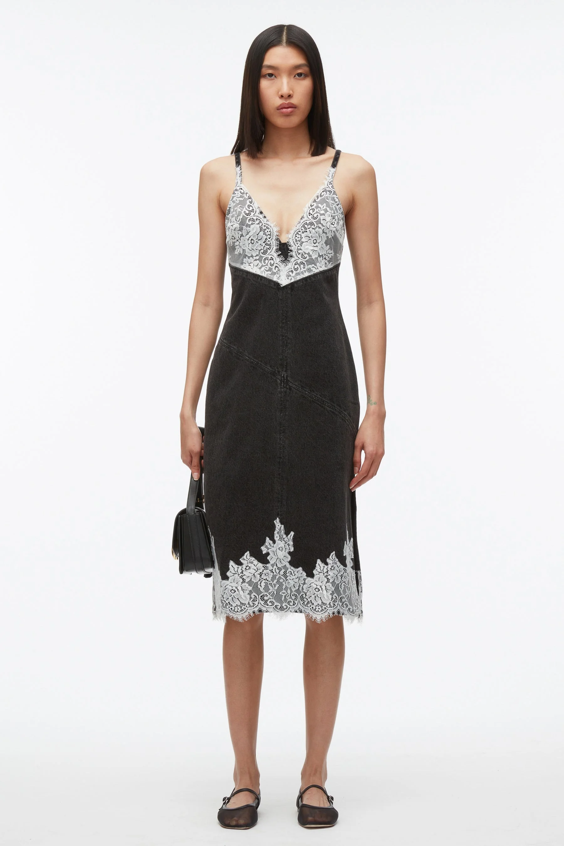 Slip dress in stonewashed denim with contrast lace trims. V-neck. Slim shoulder straps. Mid length hemline with side splits. Concealed zip-back closure. Slim fit. Lace may vary from what is pictured. - 100% Cotton - A-line - Mid / knee length - Professional dry clean only - Model is 5'10', Bust: 30', Waist: 23', Hips: 34' and wearing a size 4