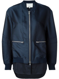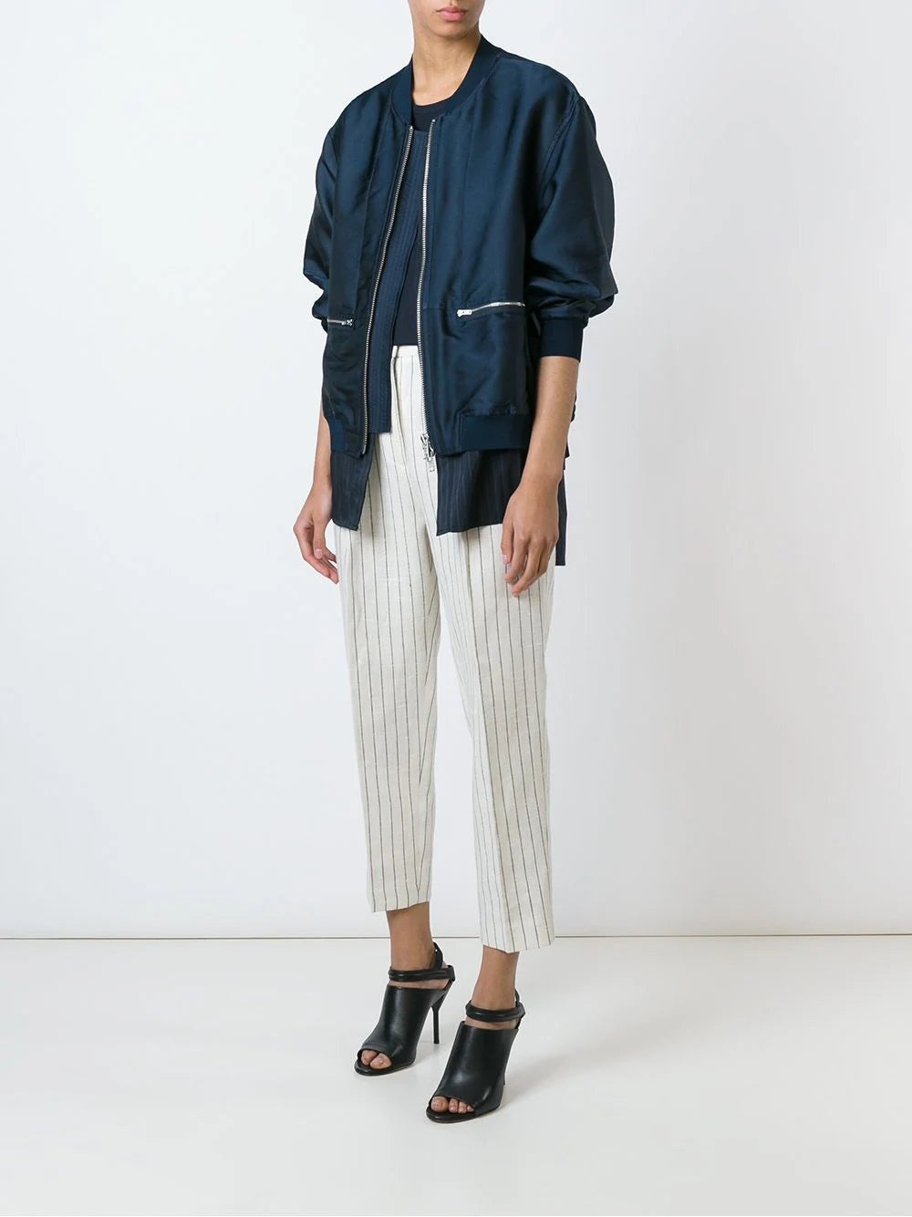 Satin bomber jacket layered over contrasting pinstripe shirt. Ribbed neck and cuffs. Front zip closure and zip pockets. - 88% Polyester, 12% Silk - Professional dry clean only