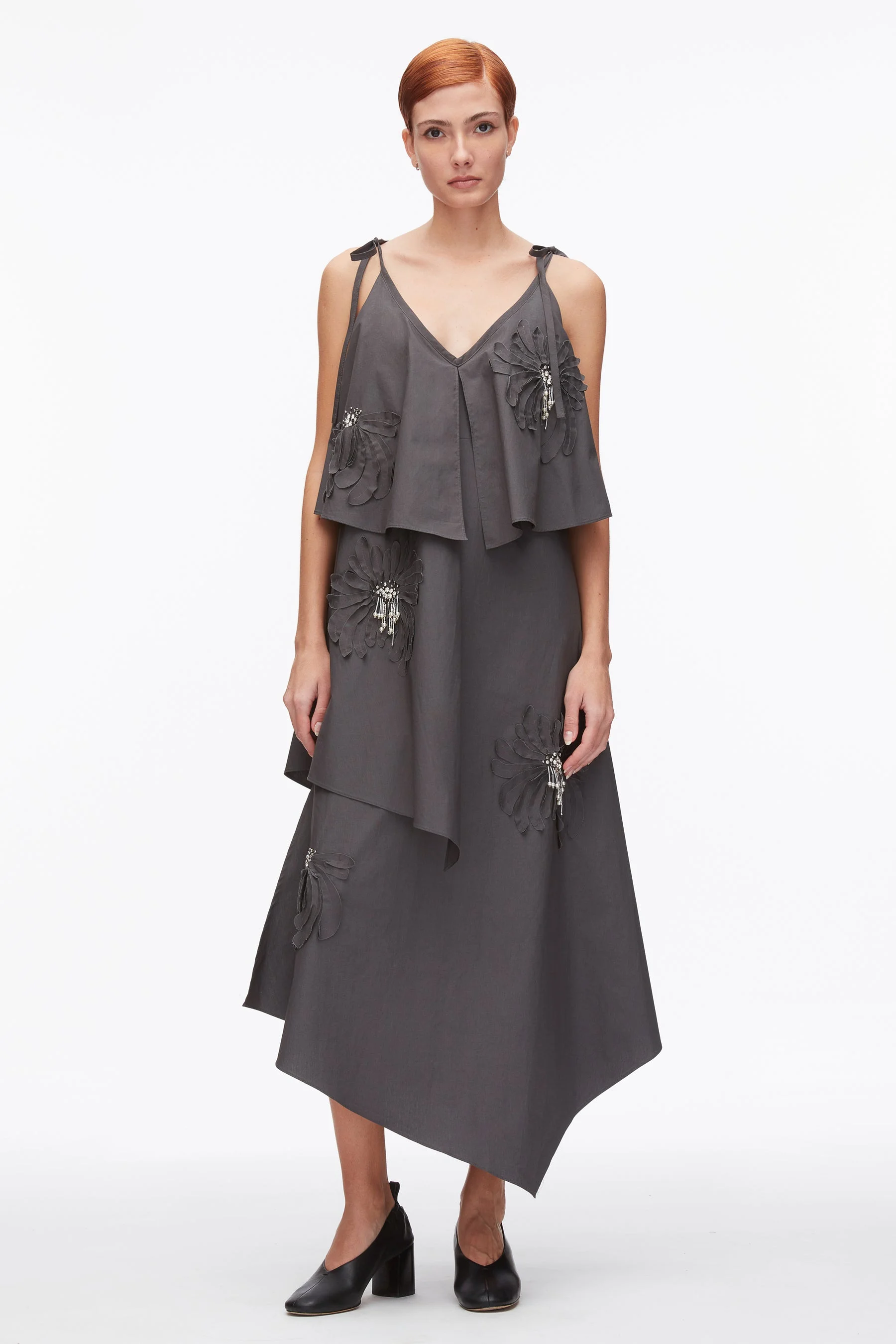 Designed to float and catch the light. This midi dress features cascading tiers finished with floral applique and metallic bead accents. The V-neckline and adjustable tie straps keep the look light and delicate. It's a silhouette that moves effortlessly, whether you dress it up or down. - 100% Cotton - Model is 5'10', Bust: 30', Waist: 23', Hips: 34' and wearing a size 4 - Professional dry clean only