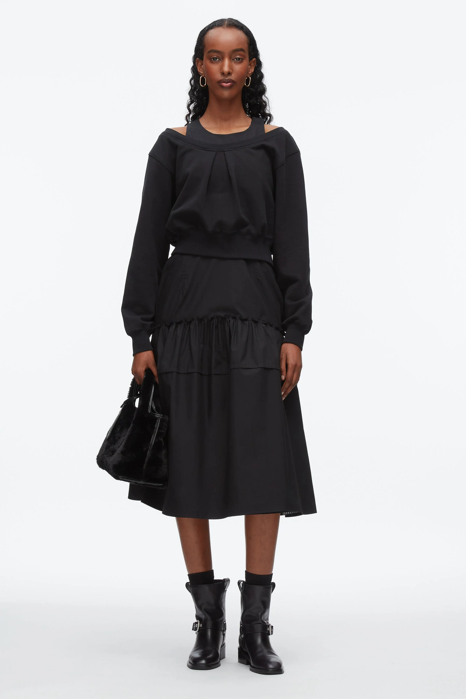 This ballet-inspired French terry combo dress balances elegance and ease with a pleated front and peekaboo shoulder detail layered over a built-in tank. Cropped at the waist, it transitions into a tiered, gathered poplin skirt for soft volume and contrast. Sporty, feminine, and effortlessly chic—it’s a one-and-done look that moves with you. - 100% Cotton - Model is 5'10', Bust: 30', Waist: 23', Hips: 34' and wearing a size 4 - Professional dry clean only