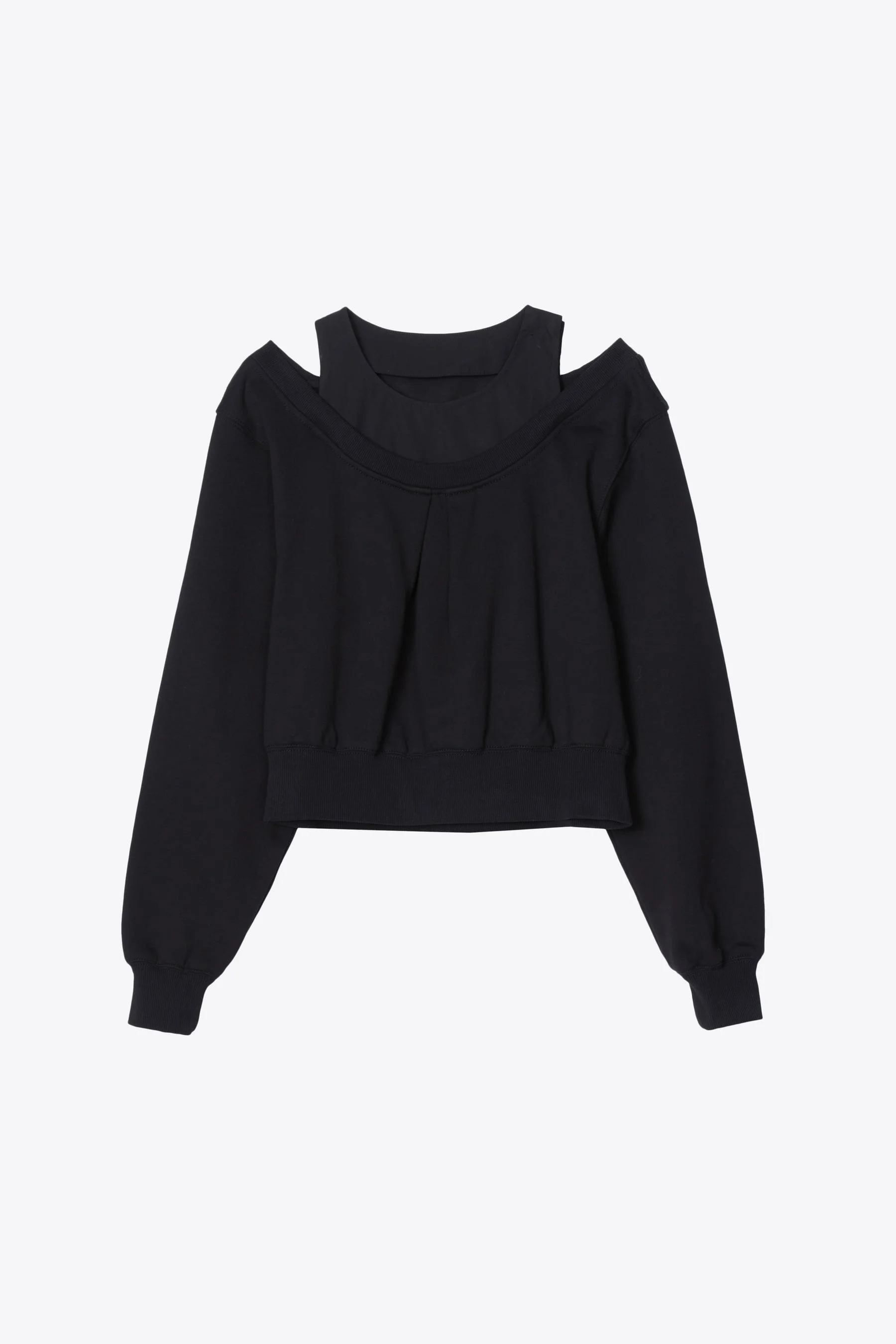 A fresh take on the classic sweatshirt, this ballet-inspired French terry combo top blends elegance and ease. Designed with a softly pleated front and peekaboo shoulder detail, it’s layered over a built-in tank—no styling required. Finished with ribbed cuffs and hem, it delivers all-day comfort with a directional twist. Pair it with cargo pants or a flowing skirt for effortless cool. - 100% Cotton - Model is 5'10', Bust: 30', Waist: 23', Hips: 34' and wearing a size 4 - Professional dry clean only