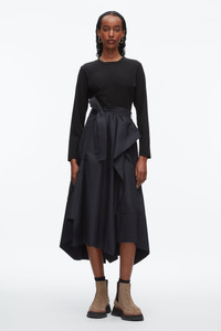 An effortlessly cool hybrid dress that plays with proportion and texture. The fitted long-sleeve jersey top meets a dramatic cotton poplin skirt, complete with asymmetric draping and a tonal sash tie at the waist. The result: a modern one-piece look with the illusion of separates. Equal parts casual and refined—wear it with boots for day or sleek heels after dark. - 70% Cotton, 30% Polyester - Model is 5'10', Bust: 30', Waist: 23', Hips: 34' and wearing a size 4 - Professional dry clean only