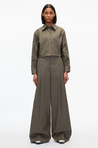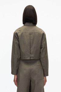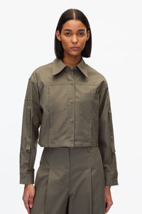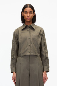 This shirt jacket is rooted in utilitarian design codes: it's cut from stretch cotton to a cropped silhouette that's framed with a point collar. It has long pleated sleeves that are fitted with a button placket tab for a customizable fit. - Point collar - Long sleeves with button placket - Box pleat and button tab at back - Cropped hem - Button front fastening - Relaxed fit - 97% cotton, 3% elastane - Professional dry clean only - Model Height: 5'10', Bust: 30', Waist: 23', Hips: 34' and wearing a size 4