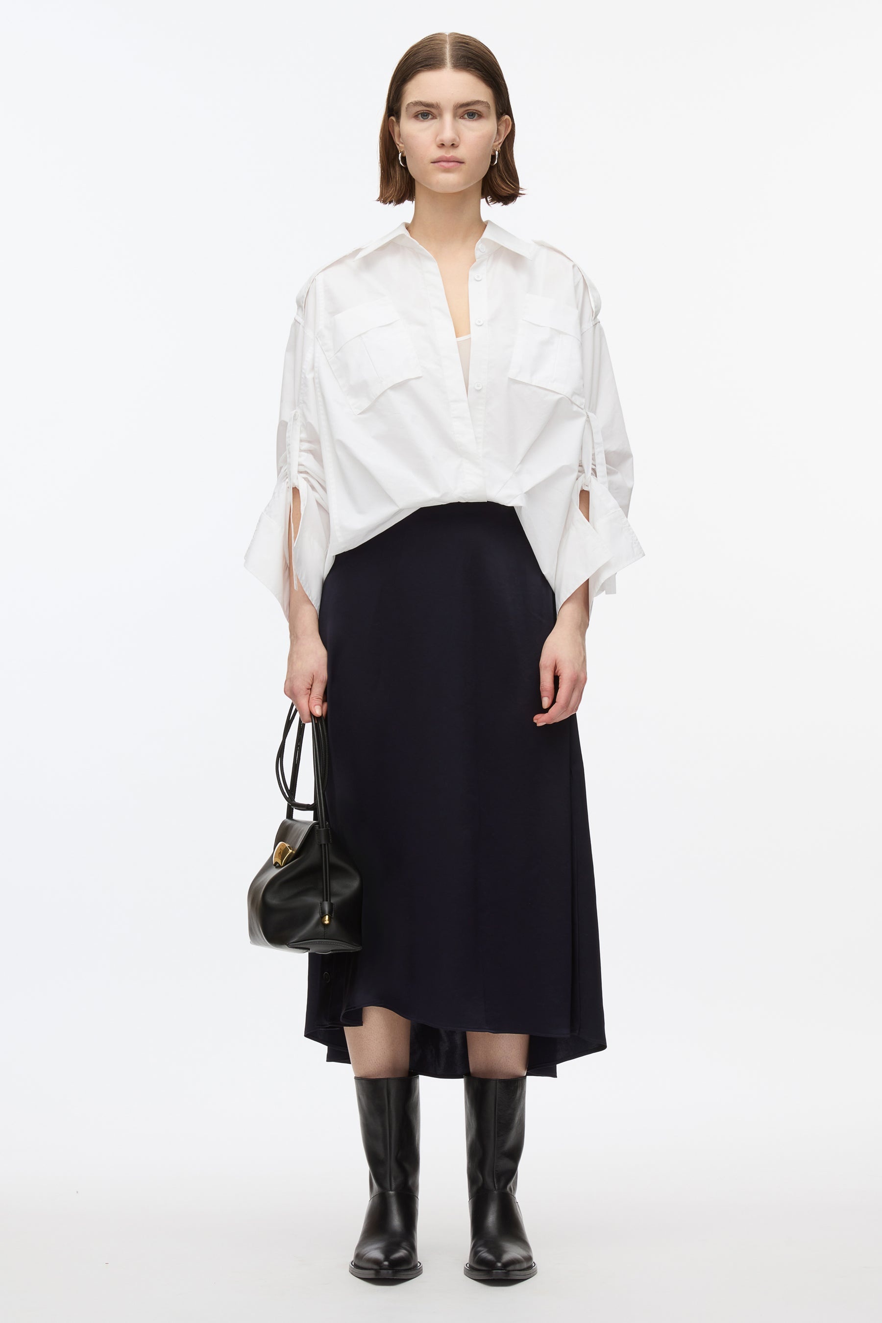 Playful sophistication is something that we are always striving for, case and point, this effortless chic shirt dress that is a trompe-l'œil all in one. Pre-styled to perfection, this dress is meant to be a throw on and go. Technical poplin top with triacetate satin skirt. Relaxed fit. - 70% Cotton, 30% Recycled Polyester - Model is 5'10', Bust: 30', Waist: 23', Hips: 34' and wearing a size Small - Professional dry clean only