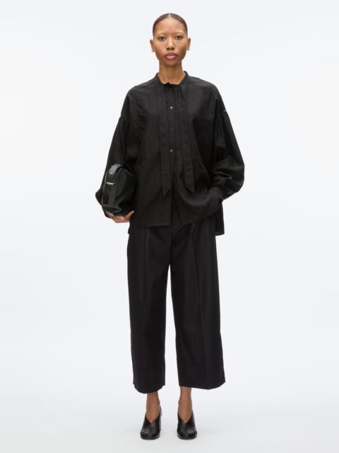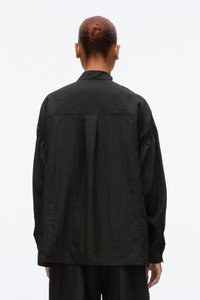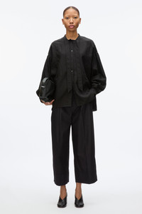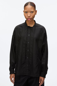 This oversized shirt, crafted from softly tumbled Tencel poplin, embodies a touch of modern romance. The generous proportions are beautifully accented by a tuxedo bib detail and a chic tie collar, adding an element of sophistication to the relaxed silhouette. - 91% Lyocell, 9% Nylon - Model is 5'10', Bust: 30', Waist: 23', Hips: 34' and wearing a size Small - Professional dry clean only