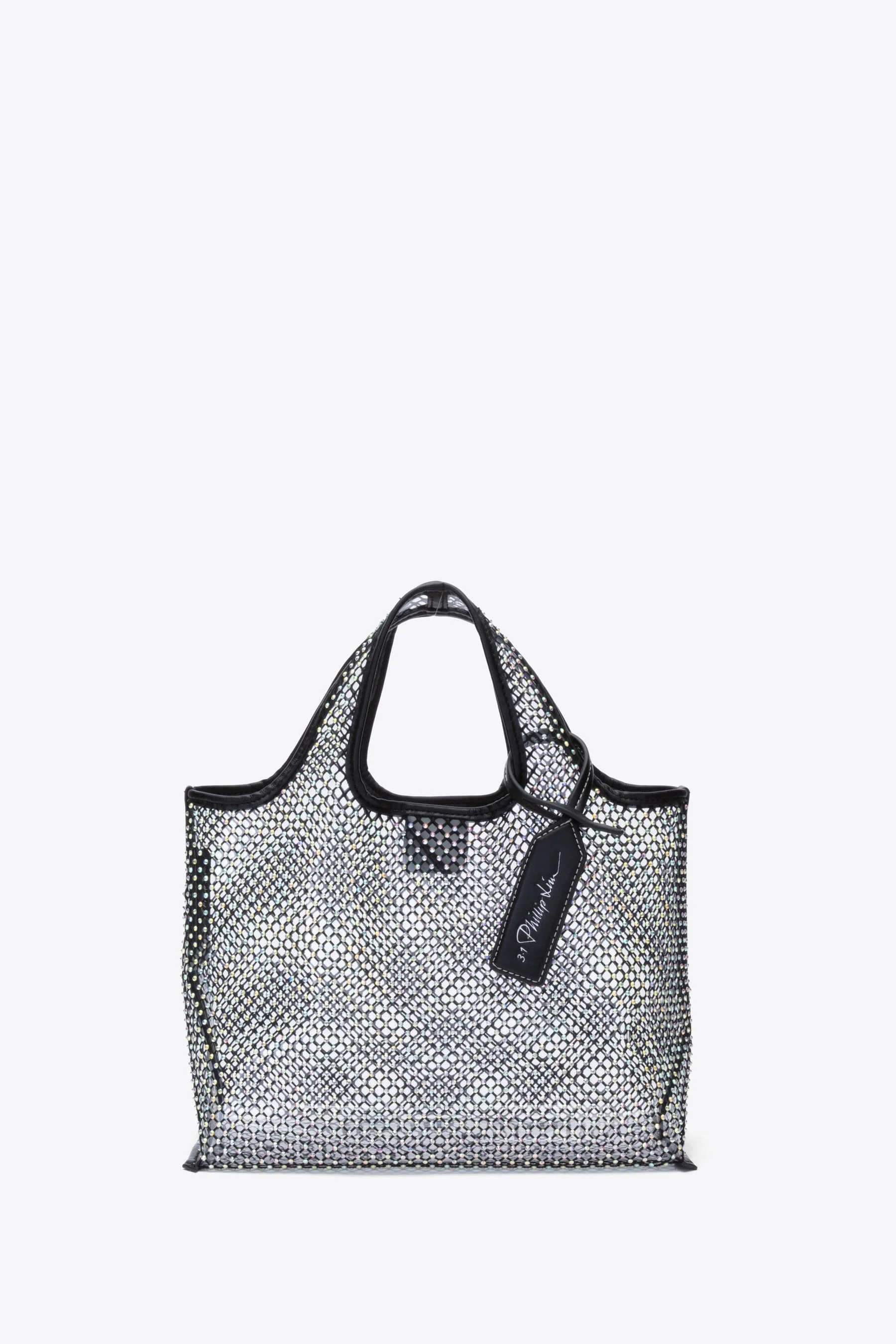 Mini market tote is a playful take on a lunch bag, realized in crystal mesh. With a silver-tone metal logo plaque. - 100% Polyurethane - Height: 8" - Width: 13" - Depth: 5" - Handle Drop: 4.5