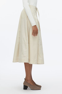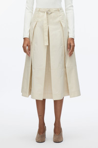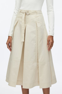 Effortless dressing is our core mantra, perfectly exemplified by this chic midi skirt featuring constructed pleating details. The figure-flattering angled seamlines and organic O-ring belt add a touch of sophistication. This versatile piece seamlessly transitions from casual day wear to polished office attire. - 70% Cotton, 30% Polyester - Model is 5'10', Bust: 30', Waist: 23', Hips: 34' and wearing a size Small - Professional dry clean only