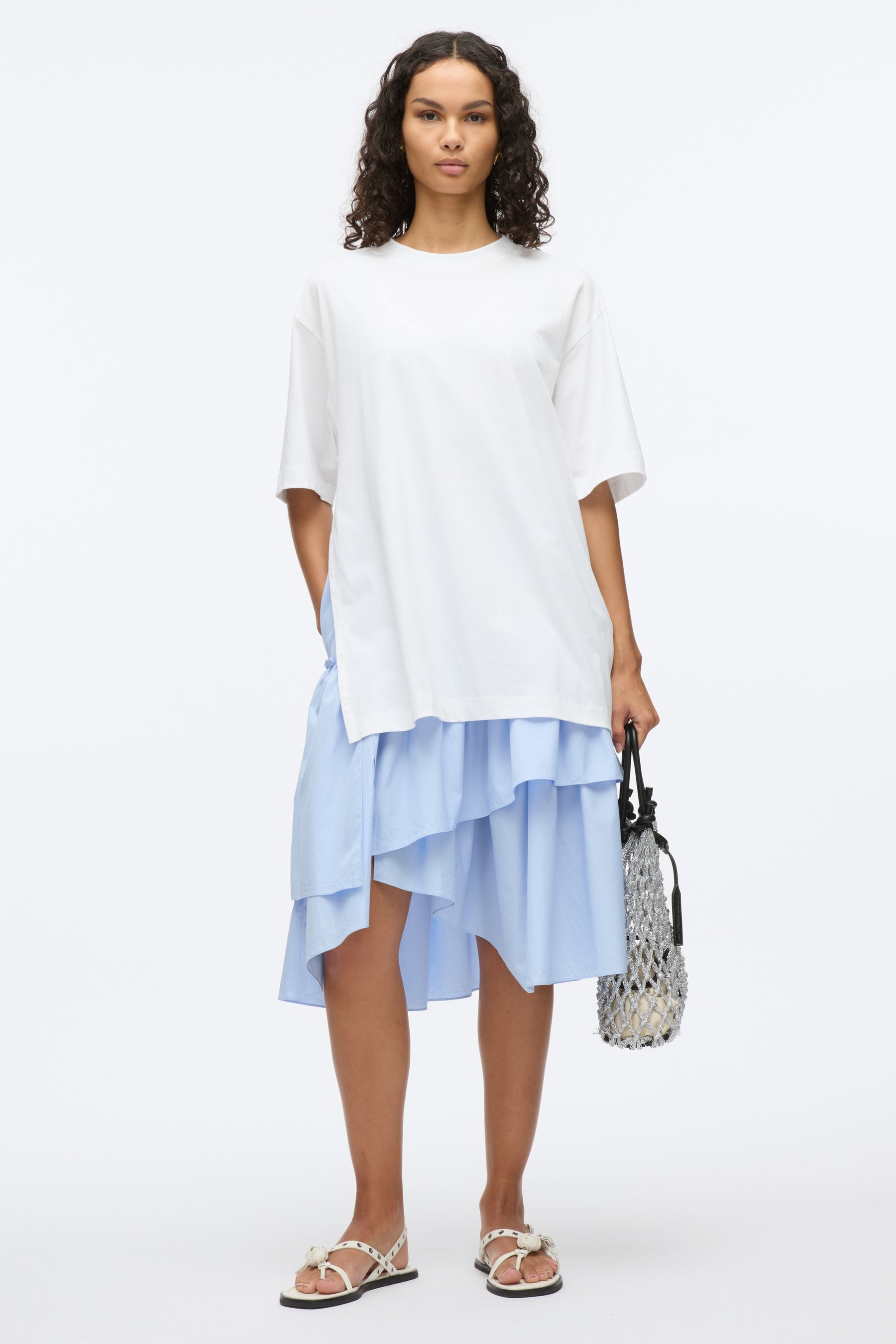 The ultimate in casual, warm-weather dressing, this versatile piece combines an oversized tee with crisp, tiered poplin layers for an effortless, breezy elegance. Designed with thoughtful details like side snaps and practical side pockets, it balances ease and functionality with a modern silhouette. Perfect for relaxed days or elevated casual outings, this dress offers a fresh take on everyday styling. - 100% Cotton - Model is 5'10', Bust: 30', Waist: 23', Hips: 34' and wearing a size 4 - Professional dry clean only
