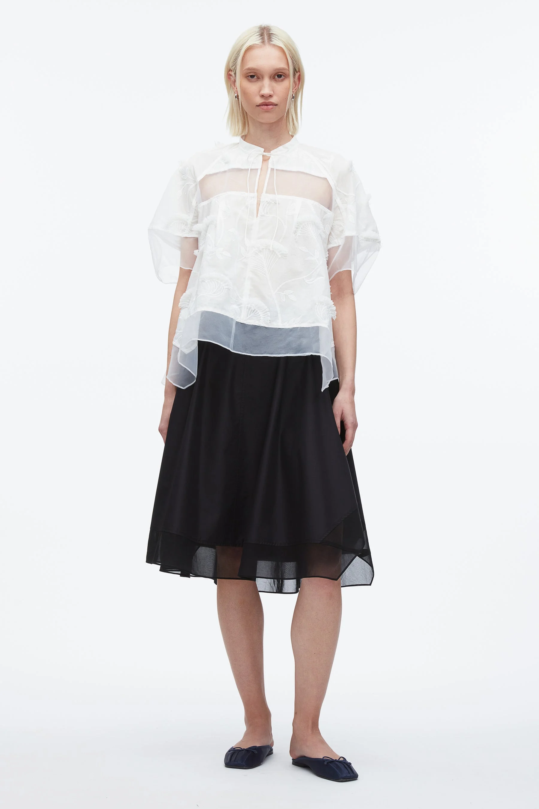 Inspired by the delicate growth of wheat stalks, this embroidered fil coupe fabric evokes pastoral beauty with a modern touch. Finished with sheer organza panels, it plays with transparency and texture to create soft volume and dimensional movement. A keyhole neckline and flutter sleeves add a romantic flourish, while the intricate embroidery brings the fabric to life with every step. Dress it up with our sheer panel skirt for an ethereal summer event look, or pair it back with slouchy denim to channel a sense of wanderlust. - 100% Cotton - Model is 5'10', Bust: 30', Waist: 23', Hips: 34' and wearing a size 4 - Professional dry clean only