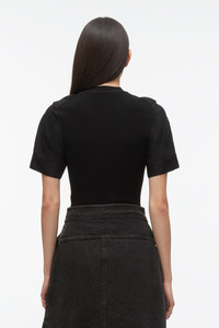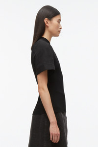Made to be the foundational building blocks to your wardrobe, this tee is knitted in a compact viscose rib with contrast sleeves. Slim fit. - 84% Viscose 16% Polyester - Short sleeve - Mid length - Professional dry clean only - Model is 5'10', Bust: 30', Waist: 23', Hips: 34' and wearing a size Small