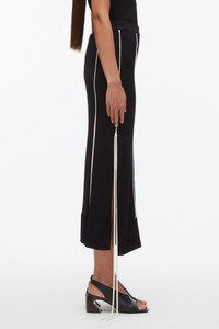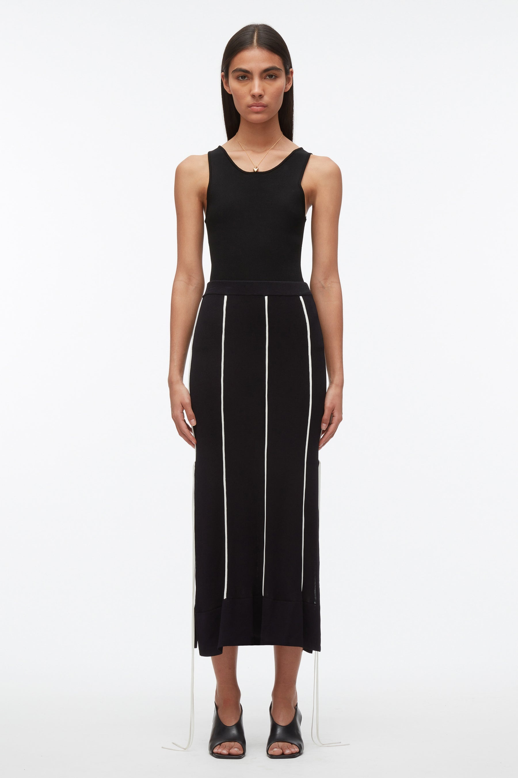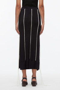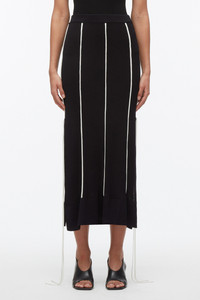 This polished pull on skirt is knitted in a luxurious viscose yarn, highlighted with contrast piping. Calf length with side slits, fitted with slight flair at the hem. - 89% Viscose 11% Polyamide - A-line - Professional dry clean only - Model is 5'10', Bust: 30', Waist: 23', Hips: 34' and wearing a size Small
