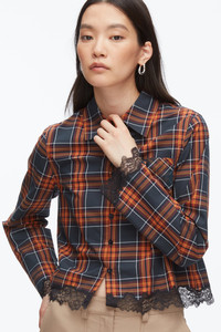 A study in contrasts, this cropped shirt pairs rugged plaid with unexpected femininity. Cut in Japanese woven cotton poplin, it features a bias-cut pocket and delicate floral lace trim at the hem and cuffs. The result is crisp, clean tailoring softened with subtle sensuality—an effortless balance of tough and tender that feels just right for Fall. Style it with wide-leg cargos or denim for a grounded yet elevated look. - 100% Cotton - Model is 5'10', Bust: 30', Waist: 23', Hips: 34' and wearing a size 4 - Professional dry clean only