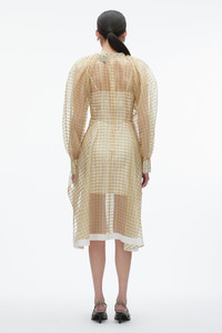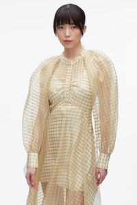 Dreamy wanderlust meets pragmatic romanticism. This airy dress is cut from our custom silk organza plaid and defined by a sculptural silhouette with soft volume through the sleeves and a handkerchief hem. Tailored cuffs add structure to the lightness, while a removable silk-cotton slip offers coverage without compromise. An effortless occasion piece—elevated, yet free of pretense. - 100% Silk - Model is 5'10', Bust: 30', Waist: 23', Hips: 34' and wearing a size 4 - Professional dry clean only