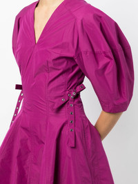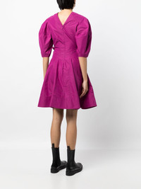 puff-sleeve V-neck godet dress