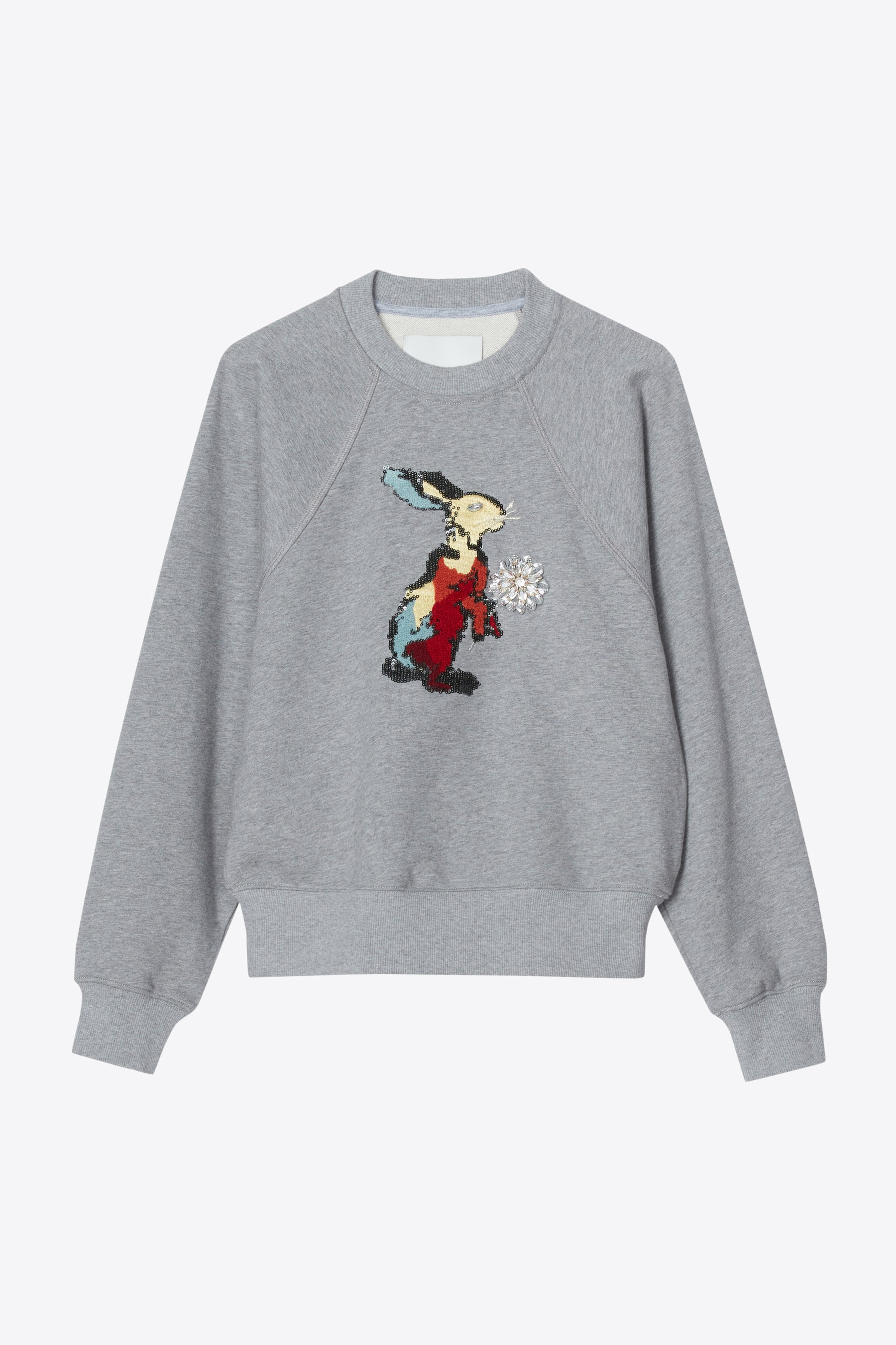 A touch of whimsy with a playful wink. This classic French terry crewneck gets a dazzling update with a sequin-embroidered bunny clutching a crystal bloom. Raglan sleeves and a relaxed silhouette keep it easy, while the intricate embellishment brings unexpected charm. Pair it with a printed skirt for a fresh, offbeat mix or wear it solo for a quiet statement. - 100% Cotton - Model is 5'10', Bust: 30', Waist: 23', Hips: 34' and wearing a size 4 - Professional dry clean only