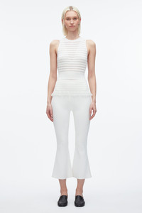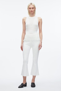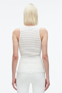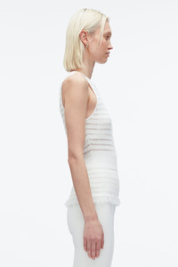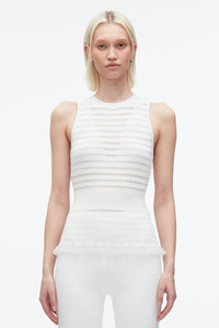 A refined take on the classic tank, this top is crafted from our delicate fine-gauge knit in a recycled viscose blend. The ribbed pleat texture and sheer stripe pattern contour the body, flaring gently into a feminine peplum hem. With a crew neckline and clean finishings, it’s a modern base layer with subtle drama—perfect worn solo or under softly tailored pieces. - 67% Viscose, 30% Nylon, 3% Polyester - Model is 5'10', Bust: 30', Waist: 23', Hips: 34' and wearing a size 4 - Professional dry clean only
