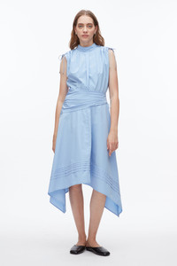 A study in modern ease. This sleeveless dress is cut from crisp technical poplin, featuring delicate drawstring ties at the shoulders and pleated detailing along the bodice for a softly structured fit. A draped, gathered waist defines the silhouette, while the asymmetric handkerchief hemline adds graceful movement. Finished with subtle pintuck accents, it’s an effortless piece designed to carry you through every moment with ease. - 70% Cotton, 30% Recycled Polyester - Model is 5'10', Bust: 30', Waist: 23', Hips: 34' and wearing a size 4 - Professional dry clean only