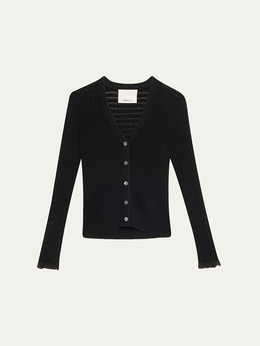 3.1 Phillip Lim cardigan in a grid check knit accented by ruffle trims Approx. 24 1/4"L from shoulder to hem V-neckline Button front Long sleeves Slim fit Viscose/nylon/polyester Imported Online Inquiries: BGS21_T6RK6| Store Inquiries: #5026345