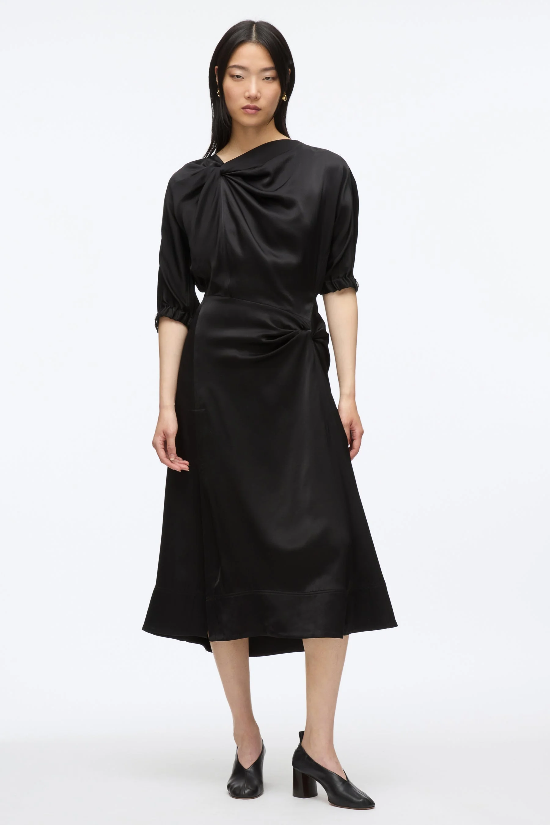 Effortless elegance defines this dress, crafted from fluid viscose satin with a luminous finish. Designed with draped knot detailing at the neckline and waist, it creates a flattering silhouette. Elasticated elbow-length sleeves add a refined touch, while the midi length ensures versatile styling. A timeless choice for elevated occasions, pair it with understated accessories to let its details shine. - 100% Viscose - Model is 5'10', Bust: 30', Waist: 23', Hips: 34' and wearing a size 4 - Professional dry clean only