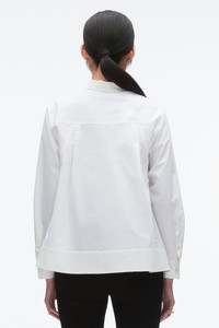 A menswear classic, reimagined through a feminine lens. Cut in our signature technical poplin, this shirt balances crisp structure with soft volume. Tonal snap buttons and a sharp collar nod to tailoring tradition, while the asymmetric hem adds an unexpected sense of playful elegance. Polished yet easy, it pairs effortlessly with slim trousers—an elevated essential for the curious adventurer. - 70% Cotton, 30% Polyester - Model is 5'10', Bust: 30', Waist: 23', Hips: 34' and wearing a size 4 - Professional dry clean only