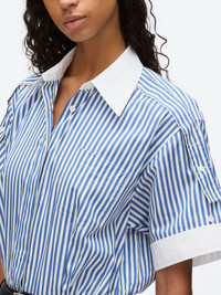 striped dress Highlights - Midnight blue - Front button fastening - Chest patch pocket - Rear button-fastening jetted pocket - Drop shoulder Imported Composition Cotton 91%, Silk 9%