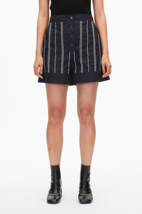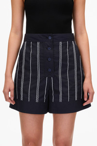 These technical poplin shorts receive a whimsically chic update with the addition of wavy stitch embroidery. A line fit with exposed button fly. Casual yet alluring, they are sure to be a part of your summer rotation. - 70% Cotton 30% Polyester - Model is 5'10', Bust: 30', Waist: 23', Hips: 34' and wearing a size 4 - Professional dry clean only