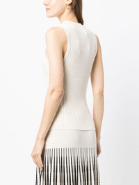 sleeveless ribbed-knit top Highlights - Ivory white/jet black - Knitted construction - Ribbed knit - Crew neck - Sleeveless - Straight hem Imported Composition Viscose 58%, Cotton 26%, Polyamide 14%, Elastane 2% SIZE & FIT Model measurements Height 5 ft 11 in(1.8 m) Bust/Chest 28.34 in(72 cm) Hips 35.43 in(90 cm) Waist 23.62 in(60 cm) FittingInformation Designed for a slim fit that sits just away from the body offering a close yet comfortable fit Made with a midweight knit, this piece offers some stretch This piece fits true to size – take your usual size Washing instructions Dry Clean Only