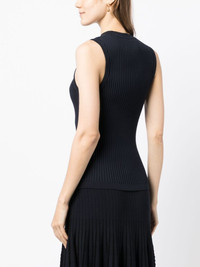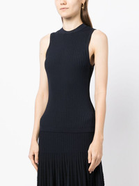 sleeveless ribbed-knit top Highlights - Navy blue - Cotton blend - Ribbed knit - Crew neck - Sleeveless - Straight hem Imported Composition Viscose 58%, Cotton 26%, Polyamide 14%, Elastane 2% SIZE & FIT Model measurements Height 5 ft 11 in(1.8 m) Bust/Chest 28.34 in(72 cm) Hips 35.43 in(90 cm) Waist 23.62 in(60 cm) FittingInformation Designed for a slim fit that sits just away from the body offering a close yet comfortable fit Made with a midweight knit, this piece offers some stretch This piece fits true to size – take your usual size Washing instructions Dry Clean Only